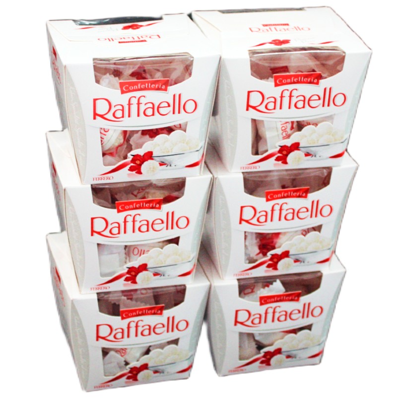 Полностью оригинальные конфеты Raffaello классик. Целых 6 коробок по 150 грамм весом каждая.