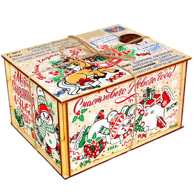 Сладкий новогодний подарок в упаковке из фанеры весом 600 грамм