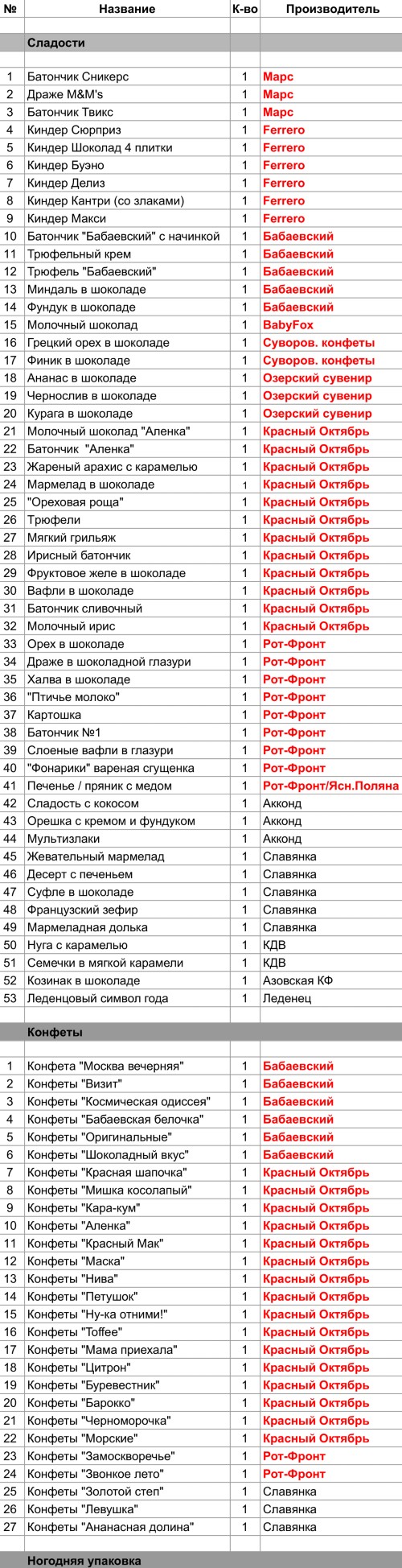 Орех в шоколаде (1 шт), Драже в шоколадной глазури (1 шт), Халва в шоколаде (1 шт), "Птичье молоко" (1 шт), Картошка (1 шт), Батончик №1 (1 шт), Слоеные вафли в глазури (1 шт), "Фонарики" вареная сгущенка (1 шт), Печенье / пряник с медом (1 шт), Конфеты "Замоскворечье" (1 шт), Конфеты "Звонкое лето" (1 шт)